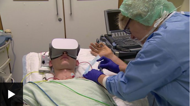 Austin Mills is being prepped for surgery after he was knocked off his bike by a car a few weeks ago. He’s wearing a virtual reality headset to distract him as he’s injected with a localised anaesthetic, which means he’ll be awake throughout his operation.