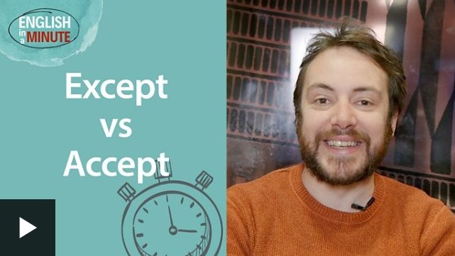 Take a look at this English In A Minute, where Roy will explain the differences between ‘except’ and ‘accept’.