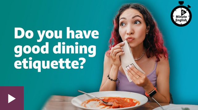 OK. Well, I asked you what listeners of the food chain thought was the biggest etiquette problem when people are eating. You said that it was people eating noisily and I can reveal… that’s the right answer! It was people eating noisily. OK. Let’s recap the vocabulary we’ve learned about mealtime dos and don’ts – rules about how you should and shouldn’t behave.